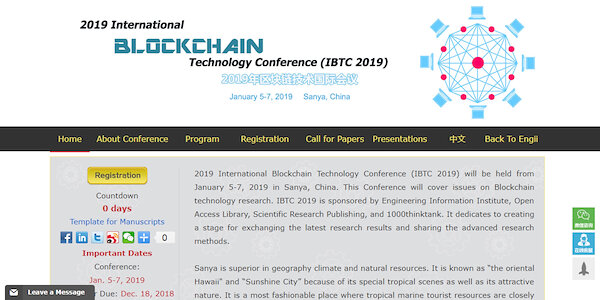 2019 International Blockchain Technology Conference (IBTC 2019) will be held from January 5-7, 2019 in Sanya, China. This Conference will cover issues on Blockchain technology research. IBTC 2019 is sponsored by Engineering Information Institute, Open Access Library, Scientific Research Publishing, and 1000thinktank. It dedicates to creating a stage for exchanging the latest research results and sharing the advanced research methods.