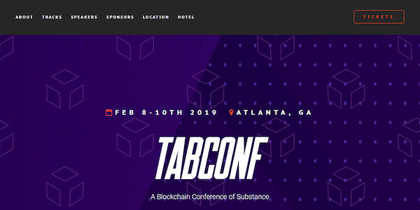 TABConf 2019 Event Description blockchain conference Details Event Date and Time: 8th February 00:00 - 10th February 2019 23:59 Location Atlanta,GA,United States View The Map Find Out More More Info