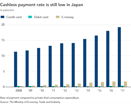 The Japanese government has been trying to encourage its citizens to use less cash and increase the amount people pay using digital methods to 40%. Currently 20% of transactionsin the Japanese economy are paid digitally, compared to South Korea where 89% of transactions are paid digitally, and in China the...