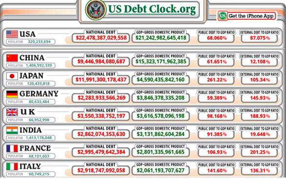 To give you a feel for the truly horrific state of affairs of how utterly out of control the debt in most major countries is, look at the US Debt Clock which illustrates in “real-time” how debt mountains are piling up in a selection of the very biggest countries in the world.