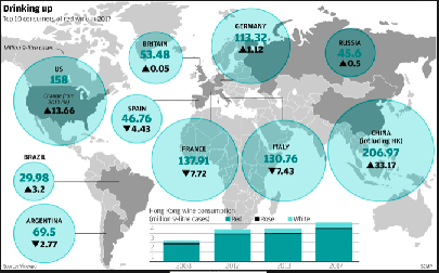 The chart above shows the demand for red wine from China and Hong Kong has been increasing, and the Asian total wine market is predicted to grow by 4% p.a from its current $57,372 million size. As the Chinese population ages, it is expected that China will become the second biggest wine market globally. The US has 8.7% of the international share of imported wine – worth $22.9 billion, according to Vinexpo/IWSR figures.